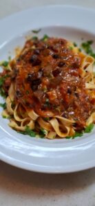 O prato é Talharim alla Matriciana, feito com tomates Meu Tomati refogados em fundo de guanciale, enriquecido com nudja (embutido picante de porco, típico da Calábria) – ambos produtos artesanais da Salumeria Cassas. O prato é finalizado com queijo pecorino. (R$ 99)
